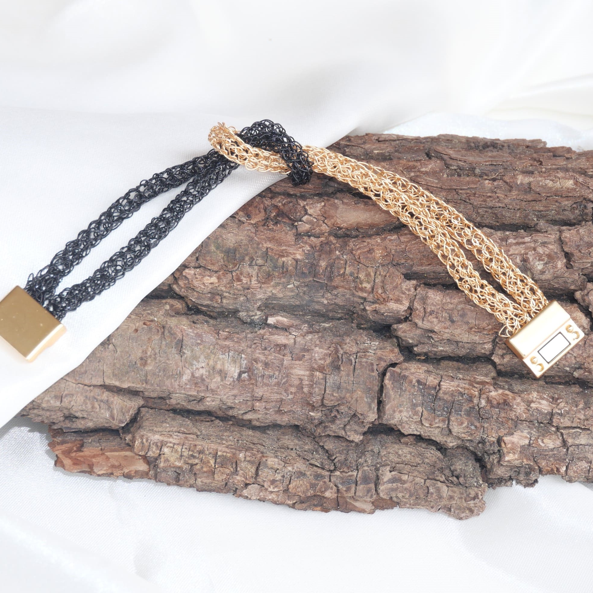 Statement-Armbänder in drei Farben – gehäkelt aus lackiertem Draht – mit Spacer und Magnetverschluss