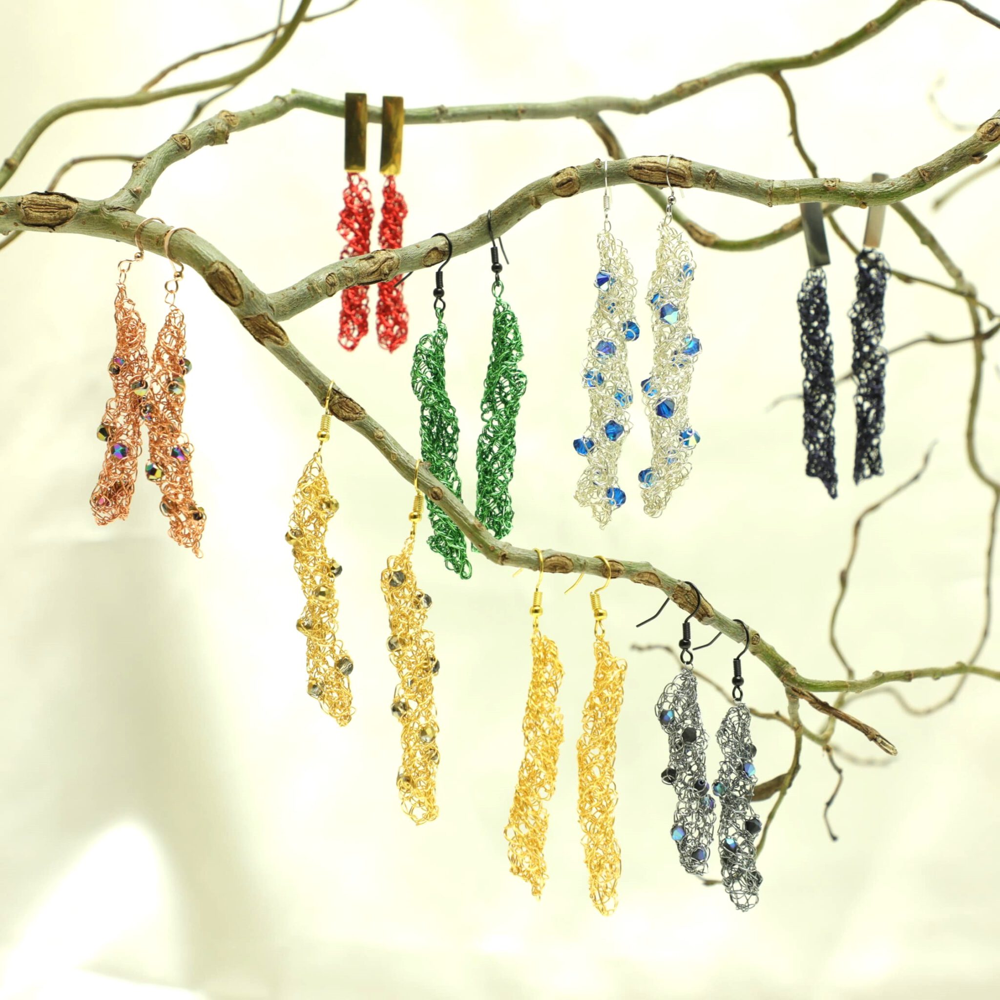 Share : Zurückspiralförmige Ohrhänger gehäkelt aus farbigem oder versilbertem Draht mit Kristallen in vielen Farben zum Hängen oder Stecken