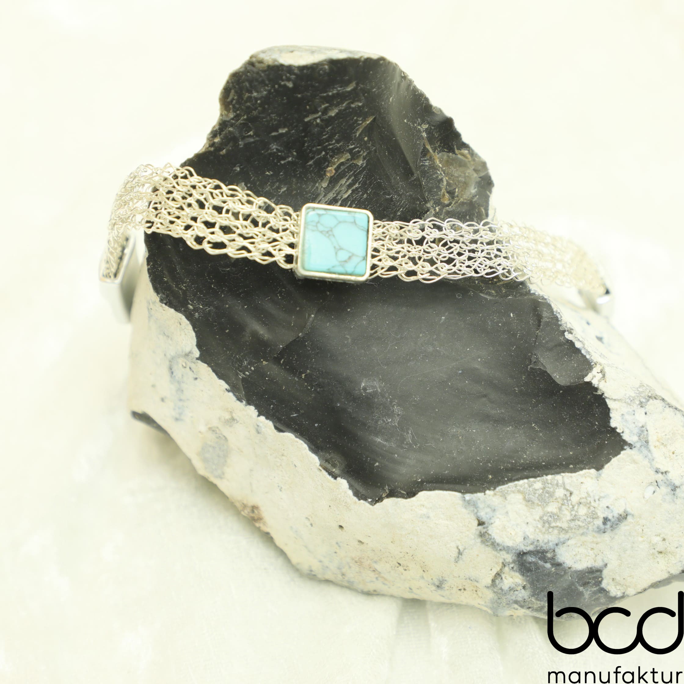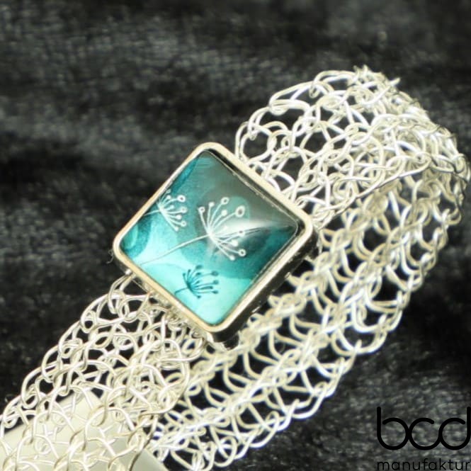 Zartes Armband, mittig mit quadratischem Cabochonträger und wahlweise Türkis-Edelstein oder Glas-Stein mit Löwenzahnblüte. Leicht, flexibel und angenehm zu tragen. Mit praktischem Magnetverschluss. Länge 18 bzw. 19 cm