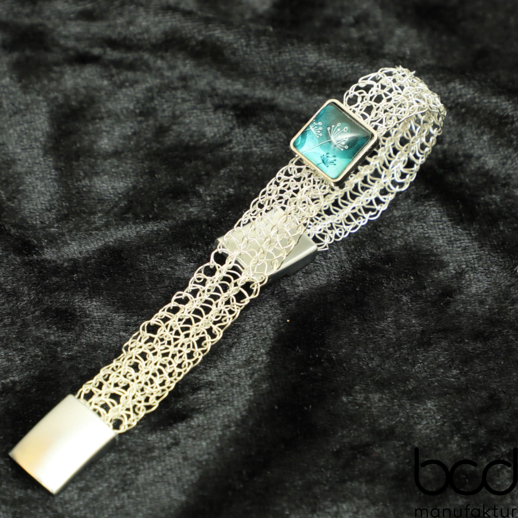 Ein quadratischer Cabochonträger bildet den Blickfang des Designs und ist wahlweise mit einem Türkis-Cabochon oder einem Löwenzahn-Cabochon verziert. Beide Motive stehen für Natur, Lebensfreude und Neubeginn und verleihen dem Armband seinen fröhlichen Charakter.