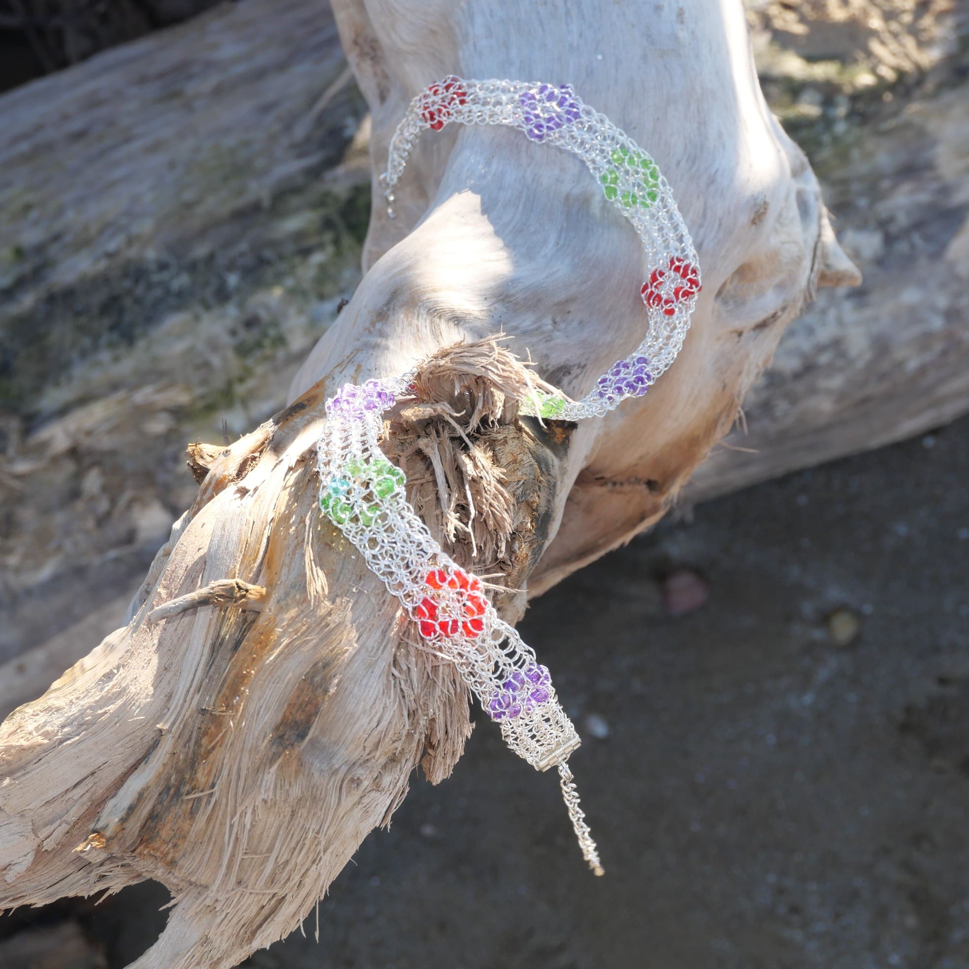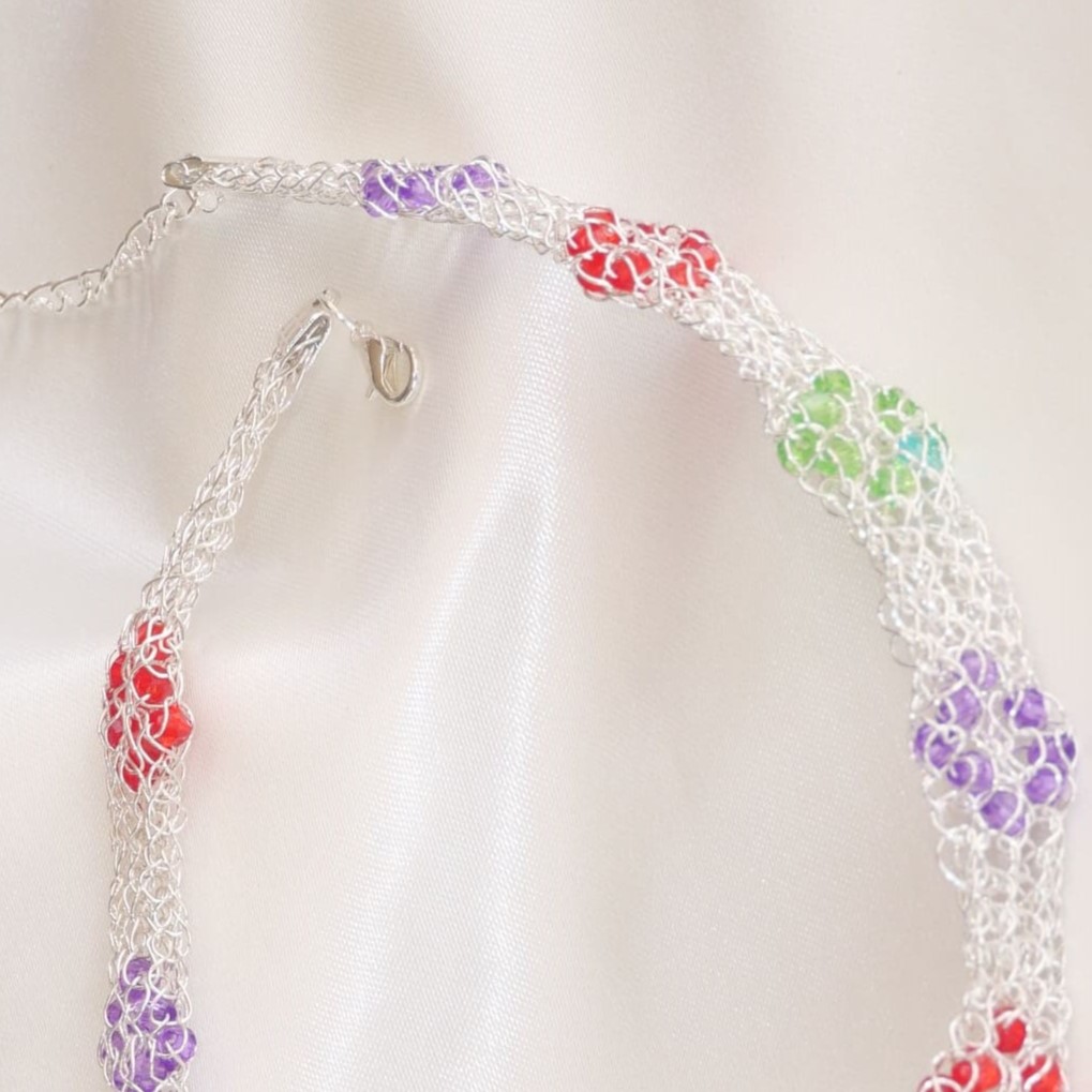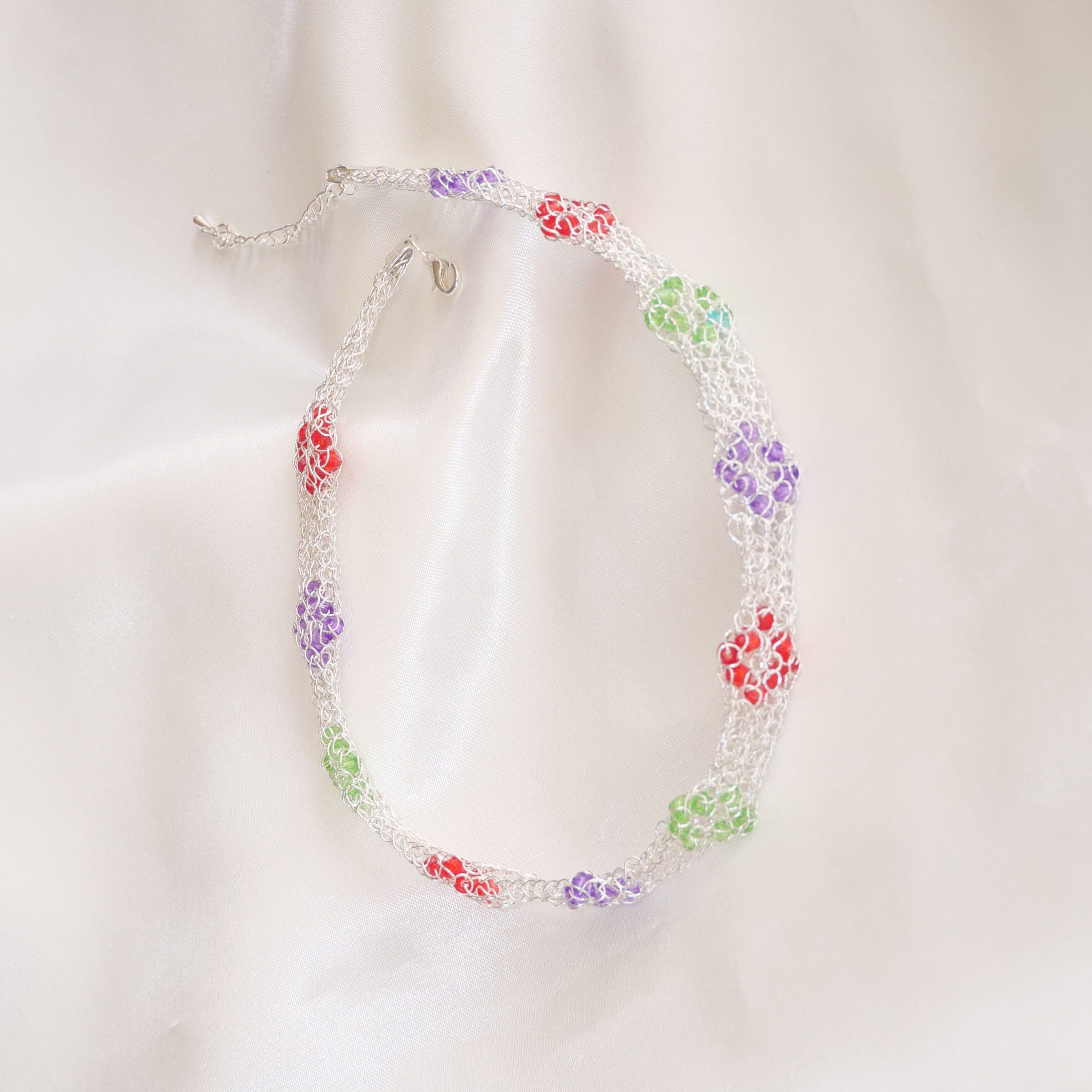 edle Chokerkette in sorgfältiger Handarbeit aus versilbertem Draht gehäkelt und über die gesamte Länge mit Kristallrauten in drei Farben verziert. Geschlossen mit versilberten Karabiner und Verlängerungskettchen